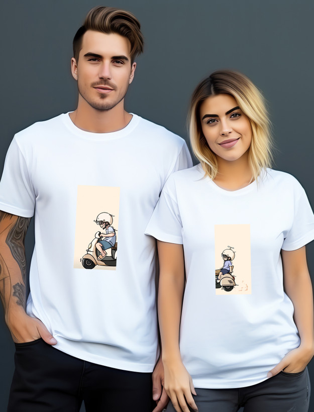 تیشرت ست مردانه و زنانه پنبه طرحدار طرح دختر پسر موتور سوار رنگ سفید برند دیجی تیشرت