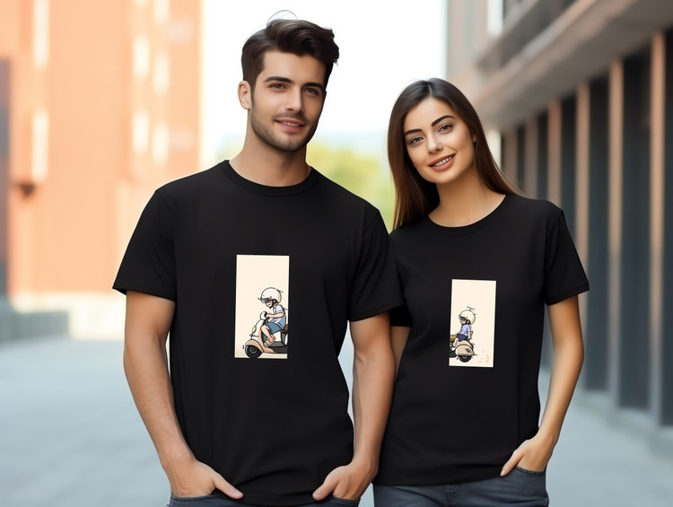 تیشرت ست مردانه و زنانه پنبه طرحدار طرح دختر پسر موتور سوار رنگ مشگی برند دیجی تیشرت